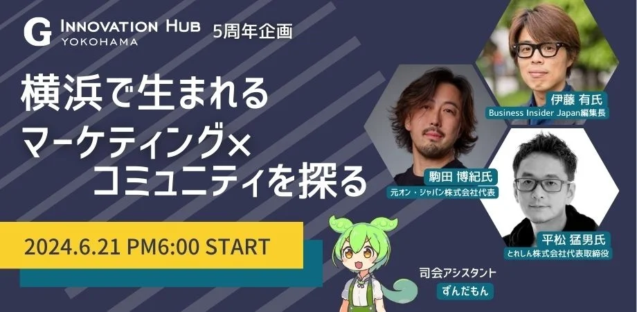 シェアオフィス・コワーキングスペース G Innovation Hub YOKOHAMAの運営開始から5周年を記念したトークイベント「横浜で生まれる、マーケティング×コミュニティを探る」において、当社の「キャラクターストリーマー」技術を活用したAIキャラクター「ずんだもん」がアシスタントとして登壇することをお知らせします。
